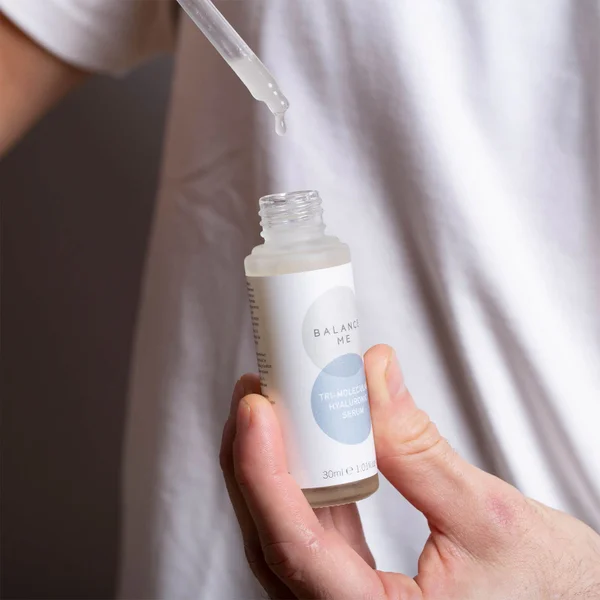 Soothe and moisturise with the Balance Me Tri-Molecular Hyaluronic Serum. Designed to replenish hydration and reduce the appearance of fine lines and wrinkles, with 98% natural ingredients. The serum is perfect for sensitive and dehydrated skin. Infused with three pioneering, natural fermentation derived, forms of Hyaluronic Acid. This combination of acids is proven to be more effective that Sodium Hyaluronate or Hyaluronic Acid alone.